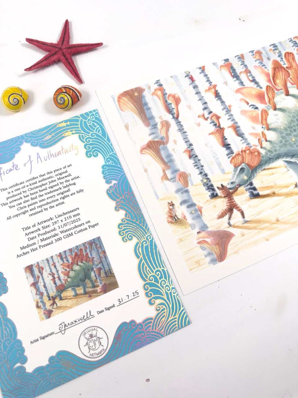 This artwork began with my love for birch trees, which I often find myself drawing without even thinking about it. I imagined a stegosaurus moving through a misty birch forest but wanted something more vibrant, so I added bright orange mushrooms growing up the trees to bring the scene to life. The protective spikes on the stegosaurus’s back echo the texture of the lichen on the trees, blending it naturally into the environment. To finish the idea, I included a character in a fox costume and a few fox friends gathering to greet this mushroom-covered stegosaurus.