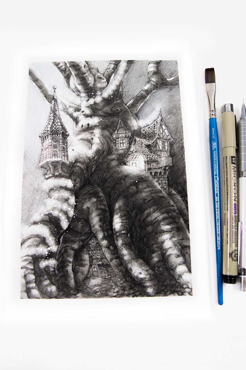 This artwork is depicting a 1000 year old enchanted tree full of wonder and mystery. A world where the majestic forests dominate the landscape.
