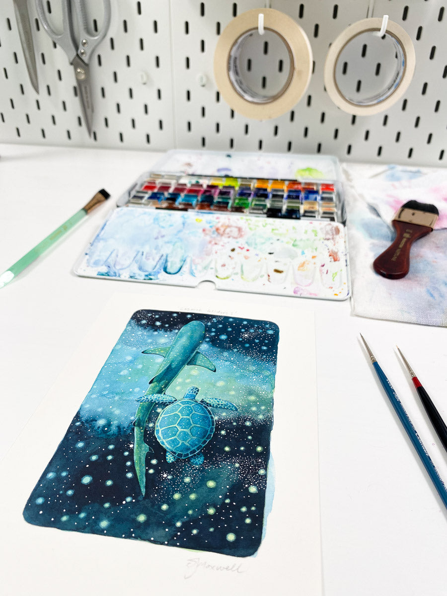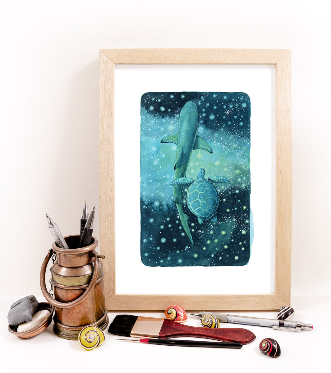 ‘Shark & Turtle’ Original – Apart of a three piece series called 'Cosmic Gliders' Inspired by the beauty of the underwater world and the endless possibilities of outer space in a delightful fusion.